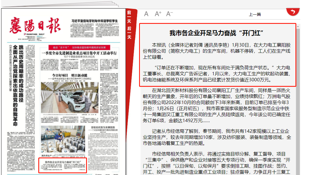 在湖北回天新材料股份有限公司襄阳工厂生产车间,同样是一派热火朝天的生产景象,开年后的订单量不断增加,业绩持续飘红;万洲电气股份有限公司2022年10月的合同额创下3年来新高,目前订单已排至今年3月份;1月26日(正月初五),我市首家国家级服务型制造示范企业中铁十一局集团汉江重工有限公司的生产人员陆续返岗,今年该公司已确定任务订单6项,金额达1492万元……