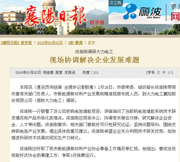 成佳刚一行察看了该公司的钒电池储能项目,详细询问了当前钒电池储能系统技术研发情况和产品市场化的难点。成佳刚还现场办公,协调有关单位对接,研究解决企业资金、人才等问题。成佳刚要求,相关部门要做好可行性研究论证,坚持问题导向,围绕支持钒电池产业发展,提出具体的意见建议。成佳刚希望企业充分利用技术研发优势,加快推进科研技术成果向现实生产力转化。