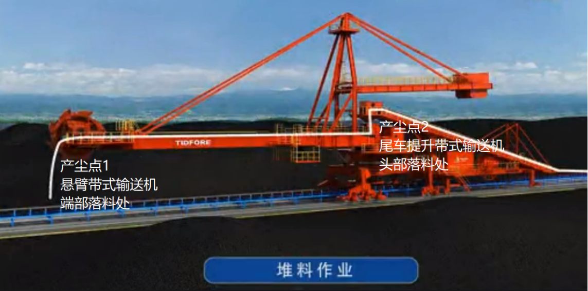 斗轮堆取料机各产尘点。堆料时尾车提升带式输送机头部落料处、堆料时悬臂带式输送机端部落料处、取料时斗轮勺斗卸料处、取料时悬臂带式输送机向煤场主带式输送机落料处。
