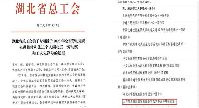 近日,湖北省总工会总结2023年全省“百千万”劳动竞赛取得的丰硕成果,进一步树立比、学、赶、超导向,加快推进湖北省高质量发展,其中,大力电工机加事业部焊接班组被授予湖北省工人先锋号荣誉表彰,展现出了大力人踏实勤奋的先进风貌。