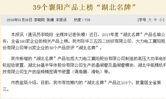 襄阳日报:大力电工襄阳股份有限公司获评“湖北名牌”